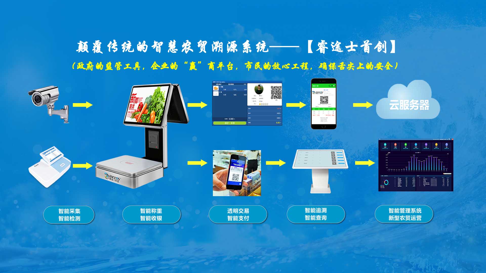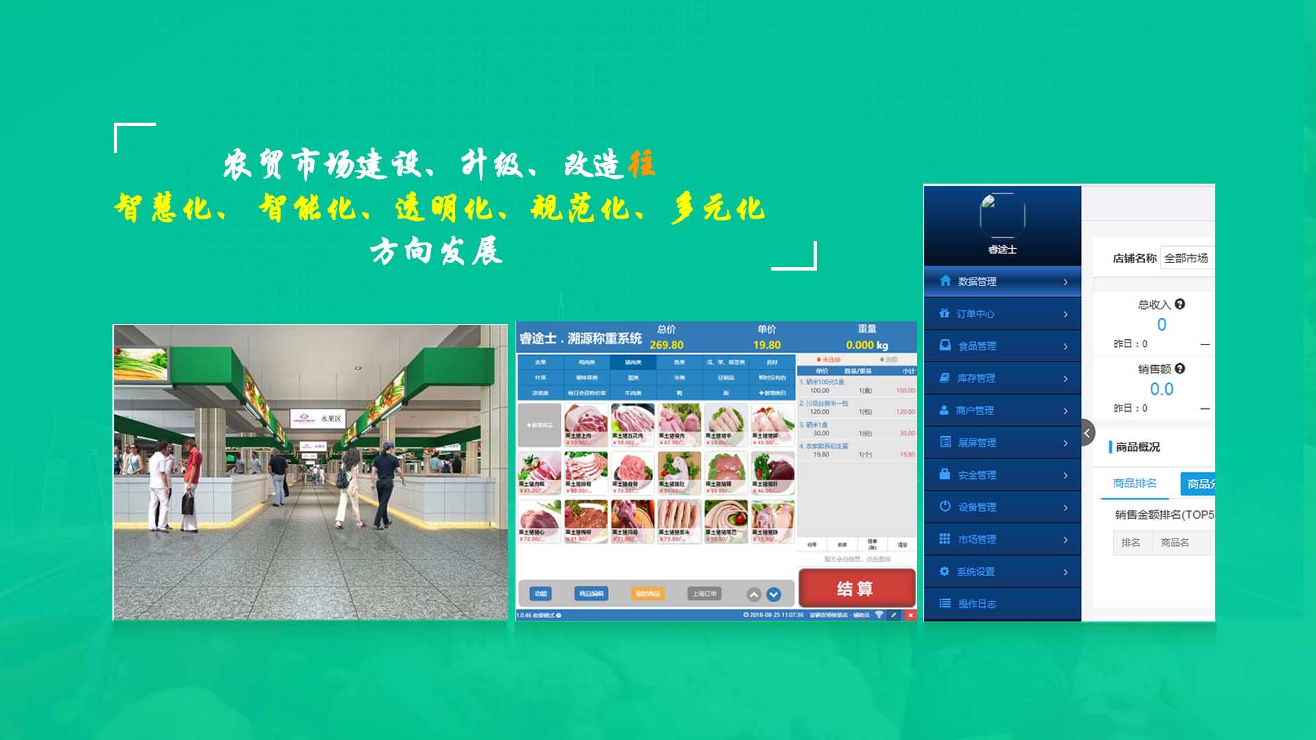 創(chuàng)新實現了【智慧農貿溯源管理系統】與【智能稱重收銀】一體化解決方案,集市場管理、運營管理、溯源追溯、智能收銀大數據運用于一體,硬件、軟件與管理系統完美結合。適用于農批、農貿市場蔬菜、生鮮、水果、水產、肉類、熟食等稱重和非稱重銷售;由于采用一體化設計,解決了傳統農貿市場無法實現的信息化、智能化、可追溯的管理問題;使稱重、收銀、追溯、管理、更透明、公正、安全,讓顧客無后顧之憂,給管理工作帶來極大的便捷與高效,對國內農產品行業(yè)的發(fā)展、農產品流通管理起到了典范作用。 【睿途士首創(chuàng)】顛覆傳統的“智慧農貿市場系統”,解決了傳統農貿系統單一安卓掛屏,昂視不方便看、不直觀、無互動性,傳輸信息不齊全、不穩(wěn)定的問題,也解決了按鍵電子秤商品難找、商品代碼難記、按鍵操作不靈活、支付不智能,對收銀管理、銷售商品、菜名、菜價、打折、優(yōu)惠、會員、線上下單、采購等無法實現實際菜品交易和追溯等問題。 更具顛覆性的是睿途士智慧系統擁有三大管理平臺(市場管理平臺、總部運營管理平臺、商戶后臺管理平臺)、一個可視操作前臺和三大追溯功能,讓遠程管理、數據傳輸、人機互動、智能控制、移動支付、大數據、互聯通信、云端存儲、人工智能、智能城市、電子定位、智能收銀等功能得以實現。